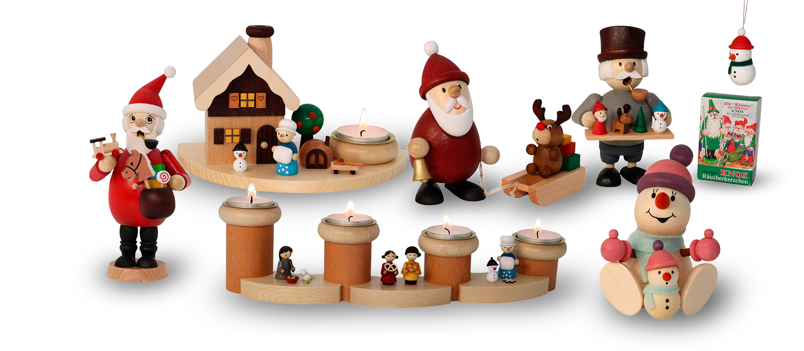 Dazu gesellen sich facettenreich Schnee- und Weihnachtsmänner, welche durch ihre strahlenden Farben besonders ins Auge stechen. Ein weiteres Highlight in der kalten, aber besinnlichen Zeit, sind unsere handgefertigten Räucherhäuser und Pyramiden.