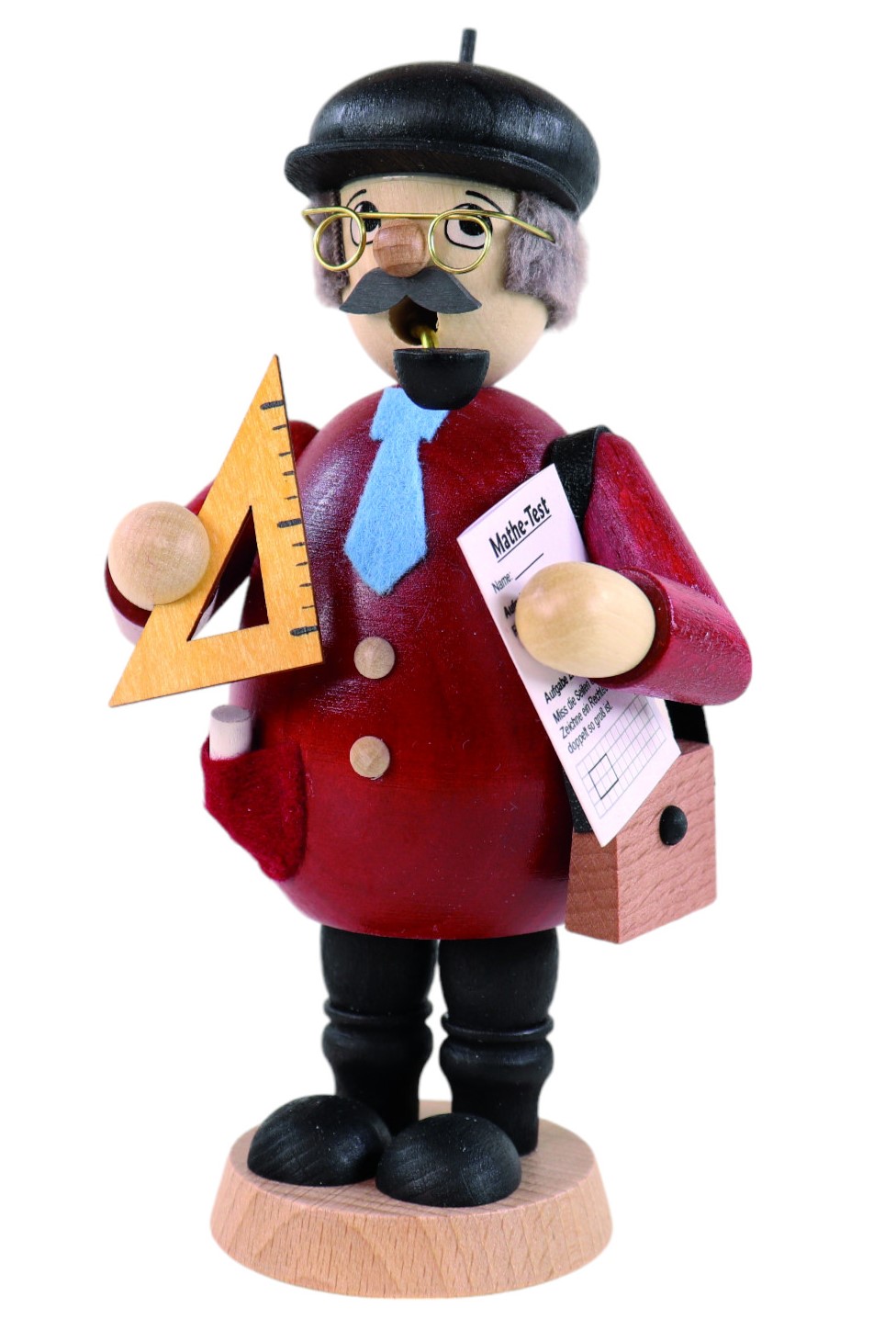 Dieser erzgebirgische Räuchermann aus unserer Werkstatt von Paul Ullrich besticht durch Liebe zu kleinen Details. Der strenge Mathelehrer ist mit allerhand kleinen Dingen für seinen Unterricht ausgerüstet. Er kommt gerade am Lehrerpult an und ruft seinen Schülern ein munteres „Guten Morgen“ zu. Er möchte heute eine Geometriestunde halten und die Mathearbeiten der letzten Stunde, korrigiert, zurückgeben. Hoffentlich war er bei der Punktevergabe gnädig. Ein wahrer Hingucker für jeden Räuchermann-Liebhaber.